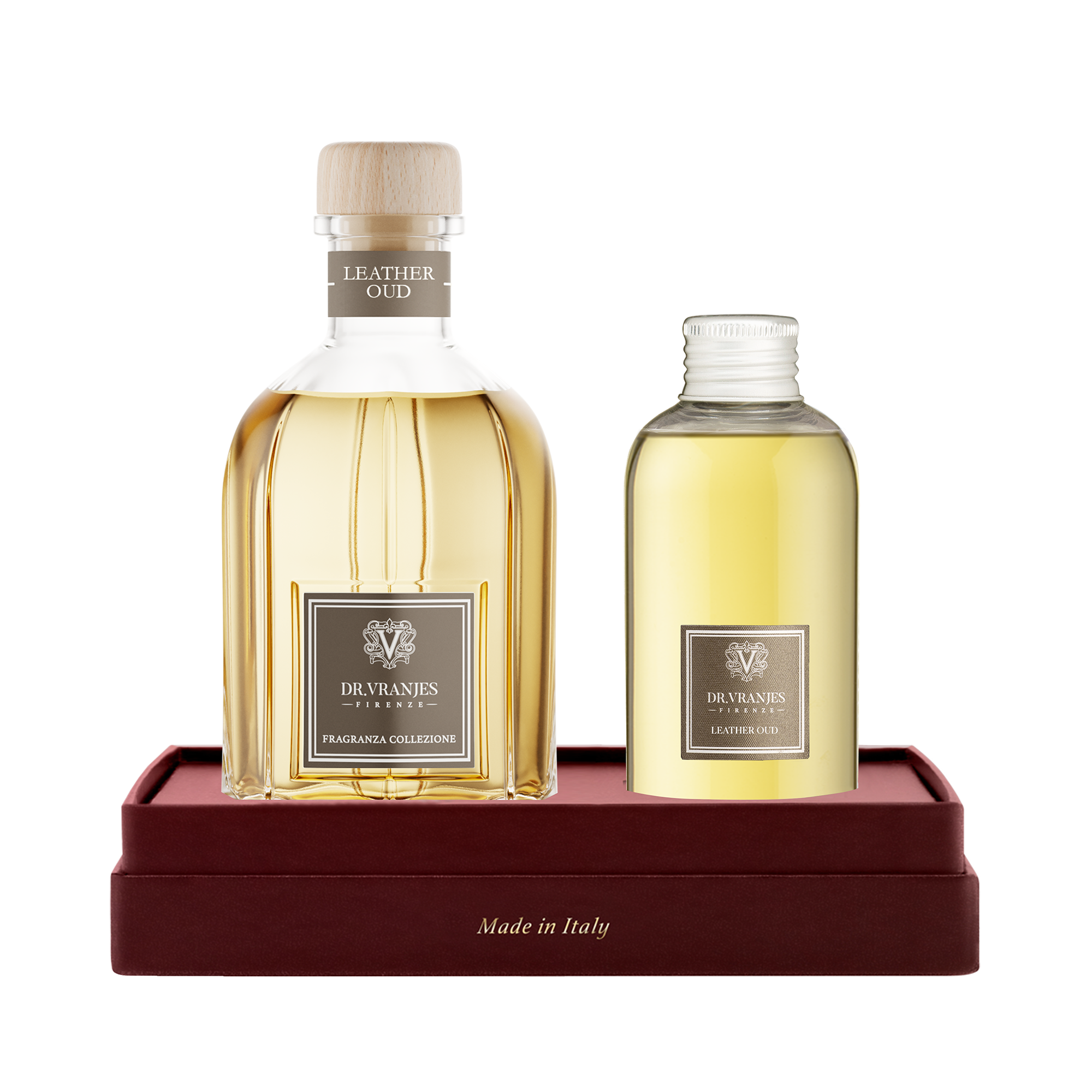 Новый аромат для дома "Leather Oud" обладает интенсивной и пышной, экзотичной и обволакивающей индивидуальностью. Это драгоценное, насыщенное и смелое сочетание нот розы и герани в верхних нотах, тосканской кожи и восточного уда в сердце, а также сандалового дерева, мускуса и ванили в базе.